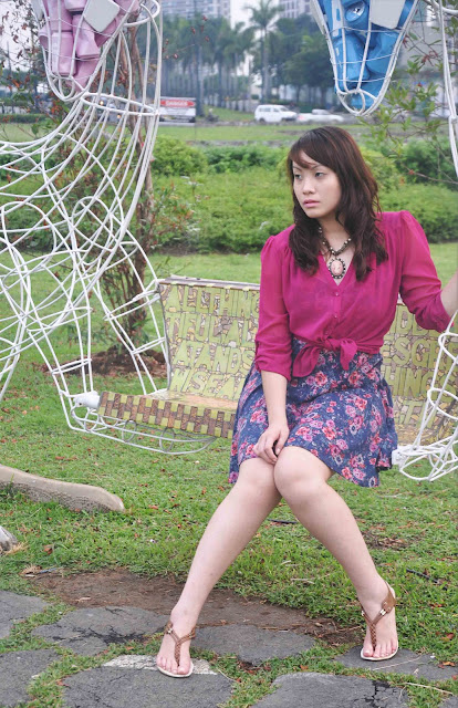 Since I did not want to show too much skin on top, I wore this long sleeves polo top over it, tied and made it a cropped cover-up. It went well with the dress because of the dark pink shade.